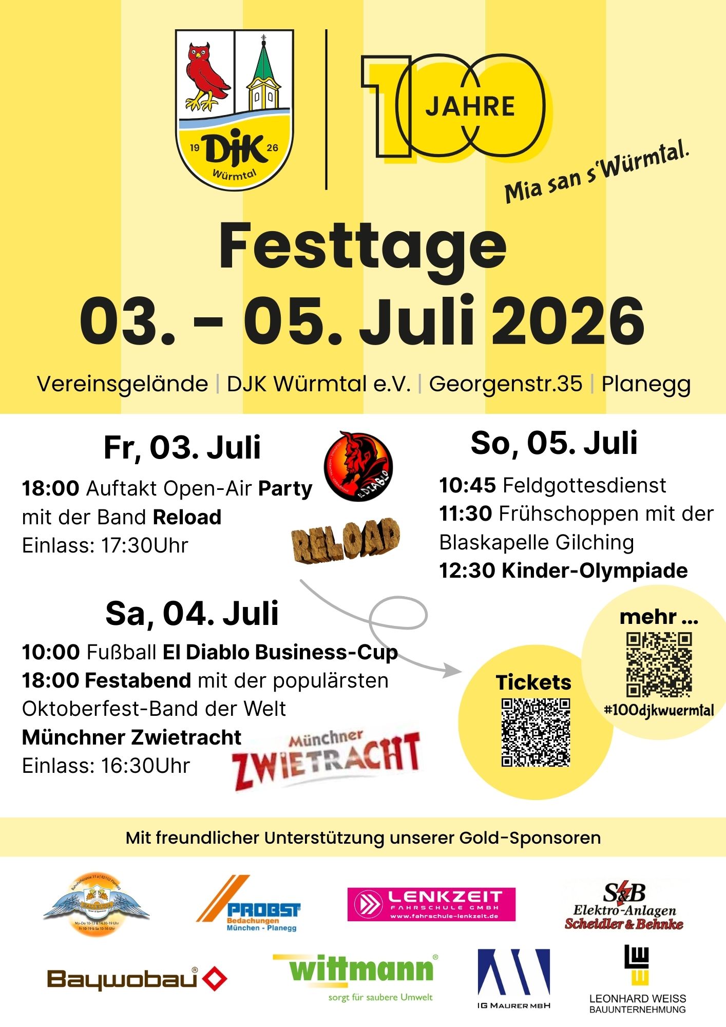 Würmtal, Dezember 2025 – Der Verein wird im kommenden Jahre 100 Jahre und feiert dieses Jubiläum im Sommer 2026 (3. bis 5. Juli) drei Tage lang mit Sport, Musik aber auch Besinnlichem. Die bekannteste Oktoberfest-Band der Welt, die „Münchner Zwietracht“ gibt beim offiziellen Festabend am Samstag ein Openair-Konzert, die Classic-Rockband Reload aus Fürstenfeldbruck sorgt für beste Stimmung bei der Auftakt-Party. Außerdem gibt es den schon den traditionellen El Diabolo-Business-Cup, ein Fußballturnier für ansässige Firmen, sowie eine Kinder-Olympiade. Ausklingen wird die Feier auf dem Vereinsgelände an der Planegger Georgenstraße mit einem Feldgottesdienst und einem Frühschoppen.